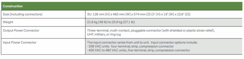 - Output Power Connector: Three-terminal, multi-contact, pluggable connector (with shielded or plastic strain relief),
