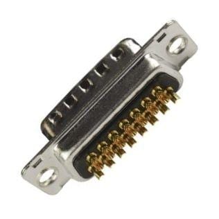 Amphenol Commercial Products L717DA15PT Plug Dsub, Machined Pin 7.5A, Straight PCB Thru Hole, Cnt Length=4.0mm (.157in), Cnt =0.6mm (.024in), 15 Pin, Bright Tin Shell+Grounding Dimples, Flash Gold, 3.1mm (.122in) Clear Hole, Without Standoff&Boardlock