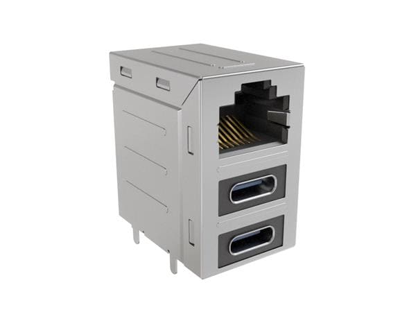 Amphenol Commercial Products RJE36188340CH RJ45 ກ້ອງກັນ Dual USB Type C ຊົມຊວນ RJ45 ກ້ອງກັນ 2 ຕົວ USB Type C ມີການຄຸດຊັບທອງຕິດຕໍ່ 50 ມາຄຣອອງ ອິນຊ