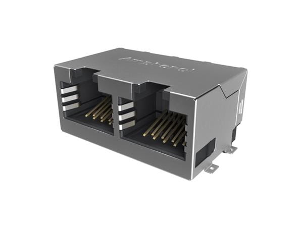 Amphenol Commercial Products RJE3B2886102N ປຸ່ມຕໍ່ເຊື່ອມ Modular Jack - 2P 8P8C, RA, CAT6, SMT, Single Port, Shield Without Top and Side EMI Tabs, With Housing Pegs, No LEDs