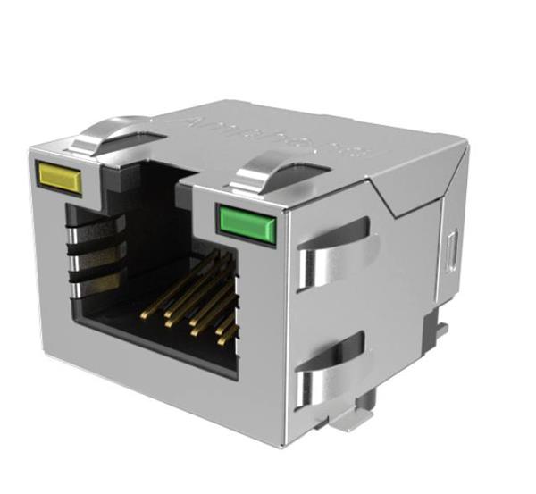 Amphenol Commercial Products RJE3C1881441 ຕູ້ຕໍ່ແບບ Modular / ຕູ້ຕໍ່ Ethernet 8P8C, RA, Cat6A, SMT, ມີປົກກັນສະຫນາມ EMI ດ້ານບົດແລະດ້ານຂ້າງ, ບໍ່ມີ Pegs, ມີ LEDs