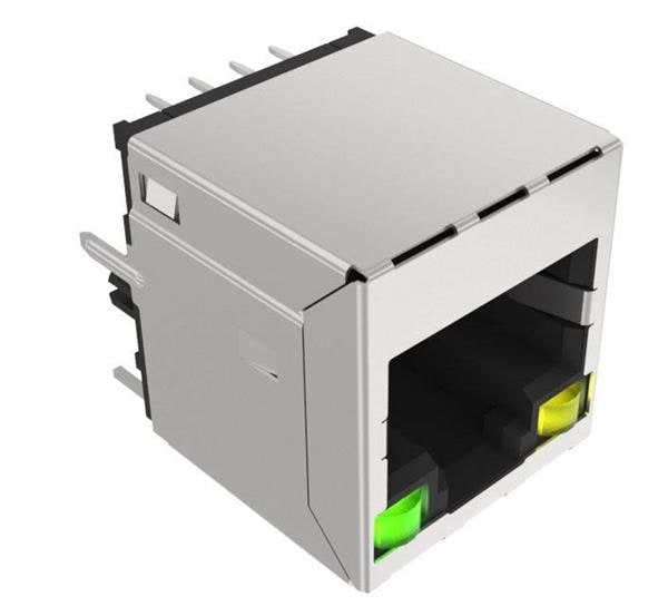 Amphenol Commercial Products RJE441882411 ຕົວເຊື່ອມຕໍ່ 8P8C, ຄວາມໄວສູງ ຕັ້ງຕົ້ນແບບຕັ້ງຕົວ, ຕິດຕັ້ງຜ່ານຮູ, CAT5E, ປົກກັນການຮອບຮວມໂດຍບໍ່ມີແທບ EMI, ມີແສງ LED ສີຂຽວ ແລະ ສີເຫຼືອງ