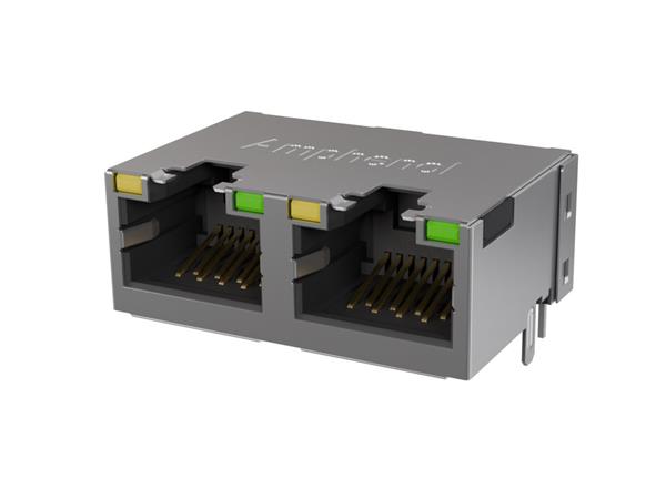 Amphenol Commercial Products RJE482886411 ຕົວເຊື່ອມ Low Profile CAT5E RJ45 - 2 ພອດ ມີ LED, ປົກກັນສະຫນັບສະຫນູນໂດຍບໍ່ມີແທບ EMI