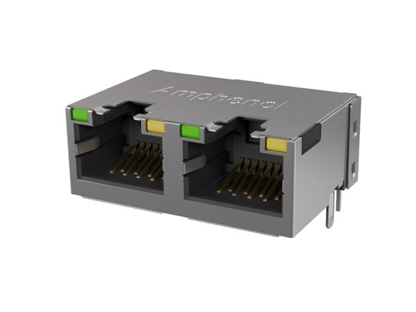 Amphenol Commercial Products RJE492886111 ຕົວເຊື່ອມຕໍ່ Low Profile CAT6 RJ45 - 2 ພອດ ມີ LED, ປົກກັນສະຫນັບສະຫນູນໂດຍບໍ່ມີແທບ EMI