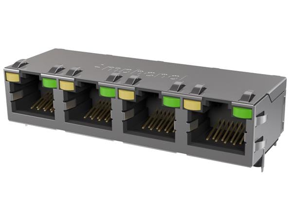 Amphenol Commercial Products RJE584885411 ຕົວເຊື່ອມຕໍ່ມາດຕະຖານ CAT5E RJ45 - 4 ພອດ ມີໄຟ LED ເຫຼືອງ, ປົກກັນສະຫນາມກັບ EMI Tabs