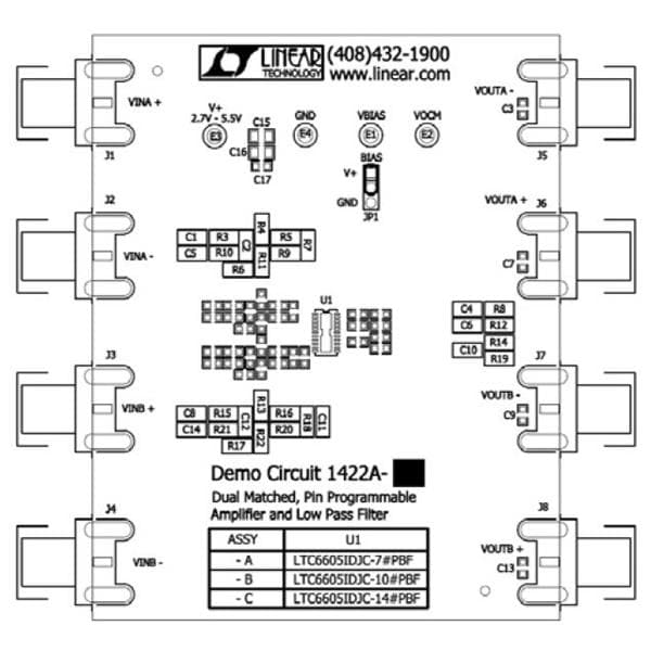 Analog Devices DC1422A-C Differential Amplifiers LTC6605-14 - ຄູ່ທີ່ກົງກັນ 14 MHz ສະໜາມສຽງຕ່ຳ | EMIN.COM.LA