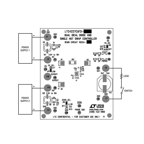 Analog Devices DC1625A-B ບອດທົດລອງຕົວຄວບຄຸມແຮງແສງສະຫວ່າງ Hot Swap Voltage Controller LTC4227CUFD-2: Dual Ideal Dio | EMIN.COM.LA
