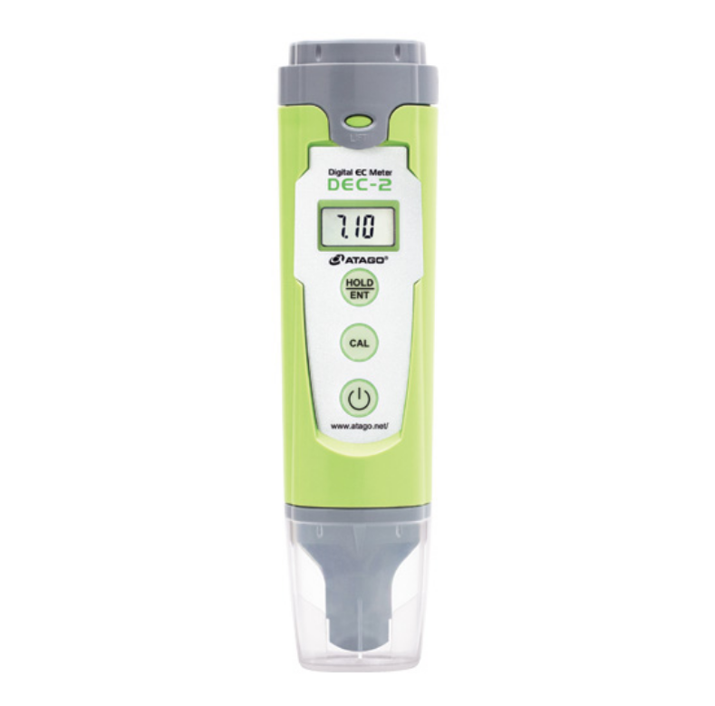 Introducing the DEC-2, ATAGO's new low Priced Electric Conductivity Meter. The compact, easy to use design makes the DEC-2 the ideal instrument to take anywhere you need to measure conductivity. The unit is water resistant (IP67). The DEC-2 also features Automatic Temperature Compensation from 0 to 50°C. For soil and hydroponics, industrial washing liquids, checking wastewater and other soluble solutions the DEC-2 is an easy and accurate, not to mention inexpensive, way to measure conductivity.