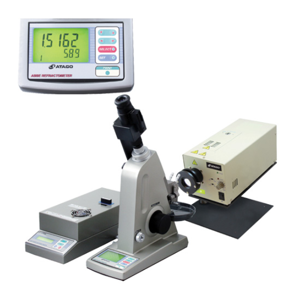 Refractive index or Abbe number (νd or νe) can be measured at different wavelengths ranging from 450 to 1,550nm. This refractometer digitallys display measurement result of refractive index or Abbe number on the LCD. This measurement can be achieved by matching the boundary line withthe intersection point of the cross hairs This is connectable with Digital printer DP-AD (B) (Optional).