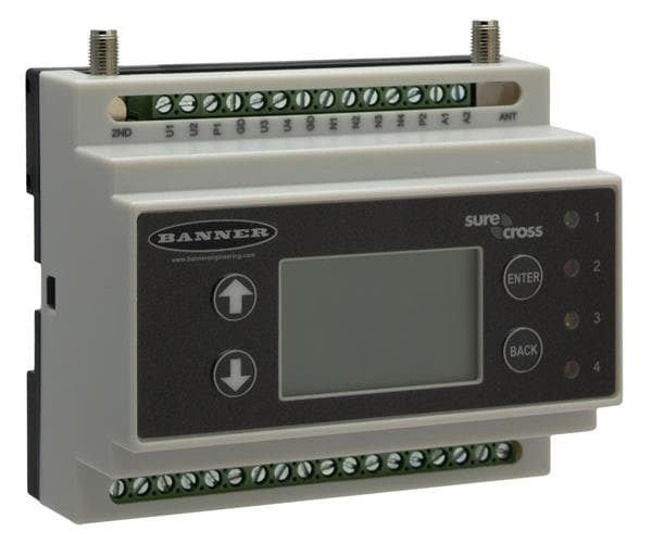 Banner Engineering DXM100-B1R2 ຕົວຄວບຄຸມ PLC DXM100; ວິທະຍຸ Multihop 900 MHz 1 W; ຂໍ້ມູນເຂົ້າ: 4 ປະເພດ Universal; ຂໍ້ມູນອອກ: 4 NMOS Discrete, 2 ອະນາໂລກທີ່ເລືອກໄດ້, 2 ພະລັງງານສະແດງສະຖານະ, 1 ພະລັງງານ Courtesy; ຕົວປະມວນຜົນ SAM4, ຈໍ LCD; RS485, Ethernet, USB, CAN, RS232, ຕົວຄວບຄຸມໂລກແລະແບດເຕີຣີ