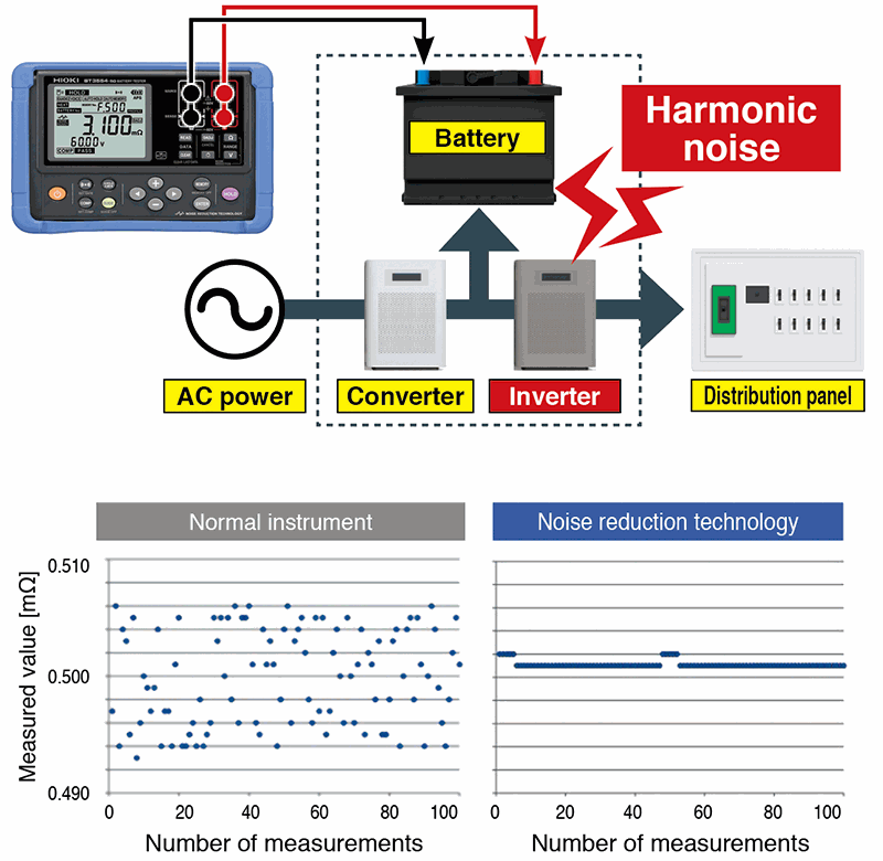 The new Battery Tester BT3554-50 sets a new standard for UPS and lead-acid battery diagnostics. Since the battery’s internal resistance and voltage are measured using the impedance method, diagnostics can be performed while the battery is connected to its host device, without taking it offline. Proprietary noise reduction technology allows more accurate measurement, even in noisy environments.