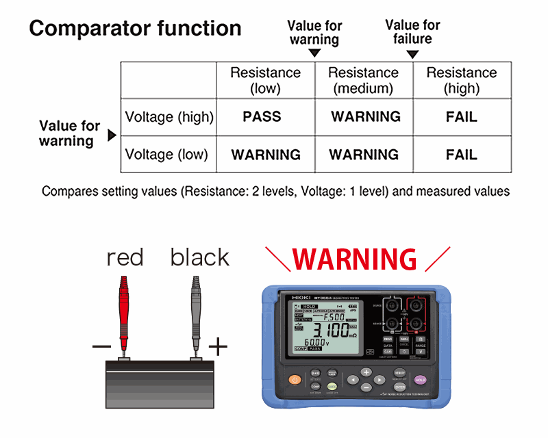- Instantaneously diagnose battery degradation (PASS, WARNING, FAIL) by measuring internal resistance and voltage*1