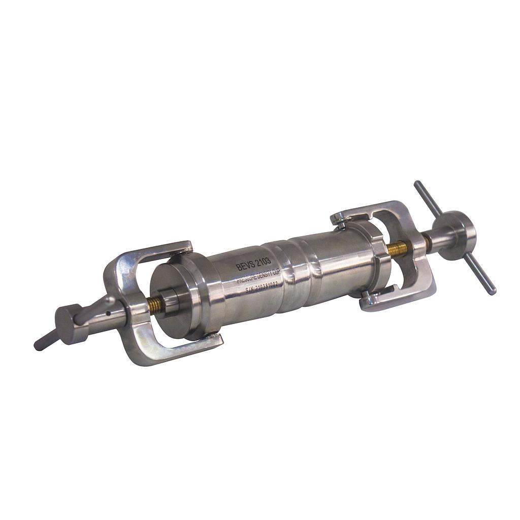 BEVS 2103 Pressure Density Cup is used to calculate the specific gravity of paints or similar material. It is of higher precision than normal one due to test sample is compressed in a stainless steel cylinder to 10 bar to eliminate the bubbles inside. Density is calculated from the mass of fluid and cylinder volume.