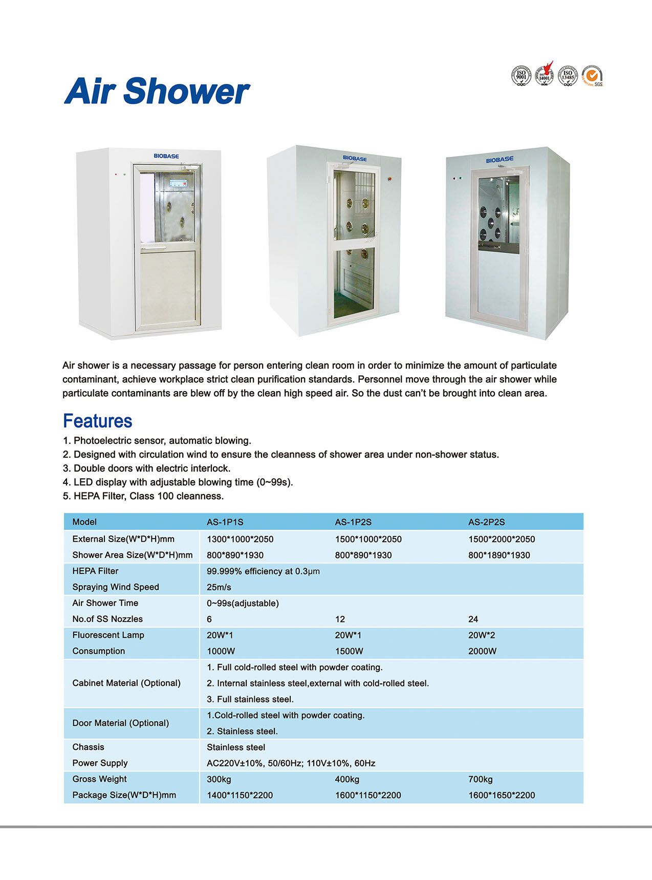 Features: photoelectric sensor,automatic blowing; Designed with circulation wind to easure the cleanness of shower area under non-shower status; Double doors with electric interlock; LED display with adjustable blowing time (0~99s); HEPA Filter,Class 100 cleanness