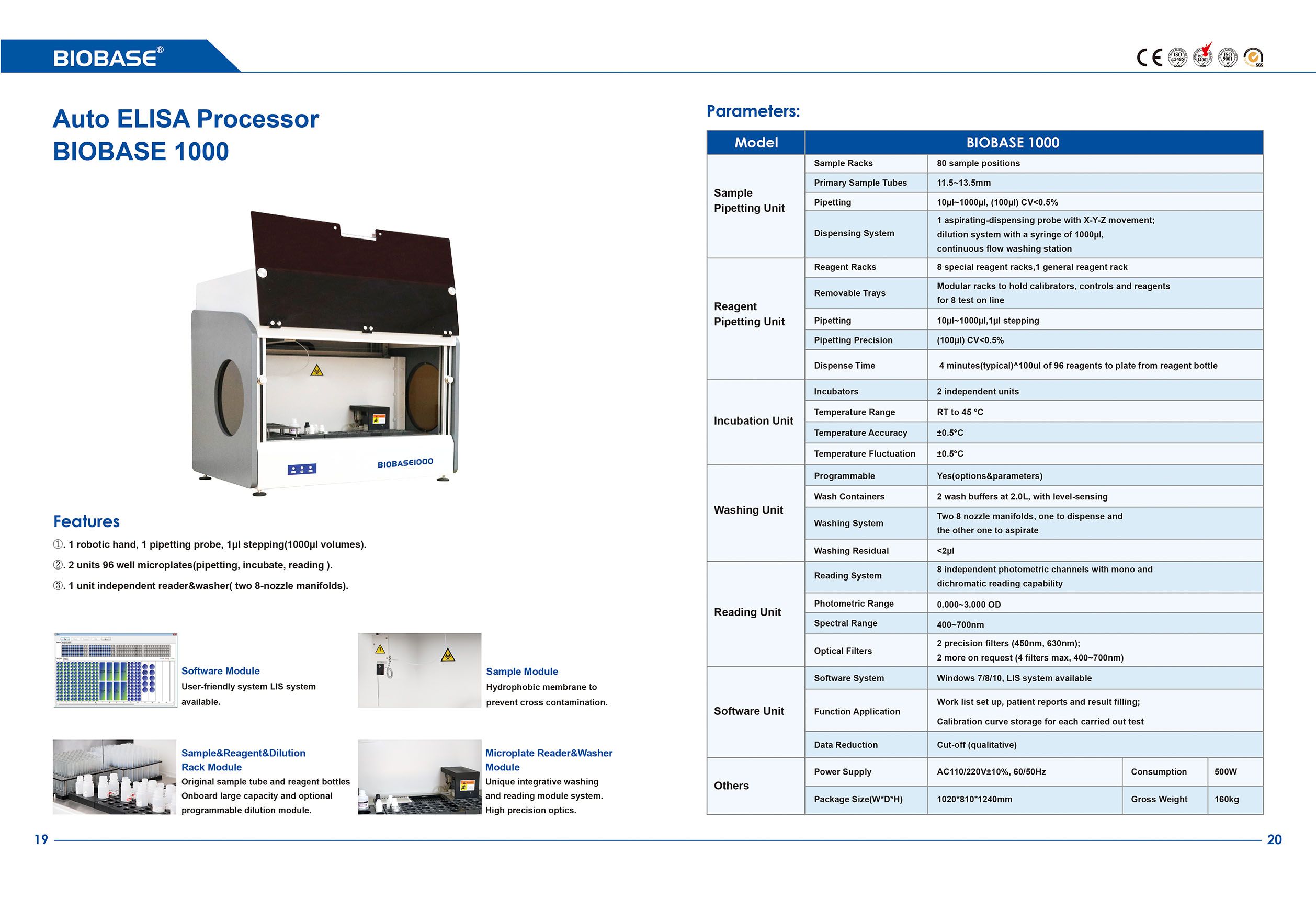 Dispensing System: 1 aspirating-dispensing probe with X-Y-Z movement; dilution system with a syringe of 1000ul, continuous flow washing station.