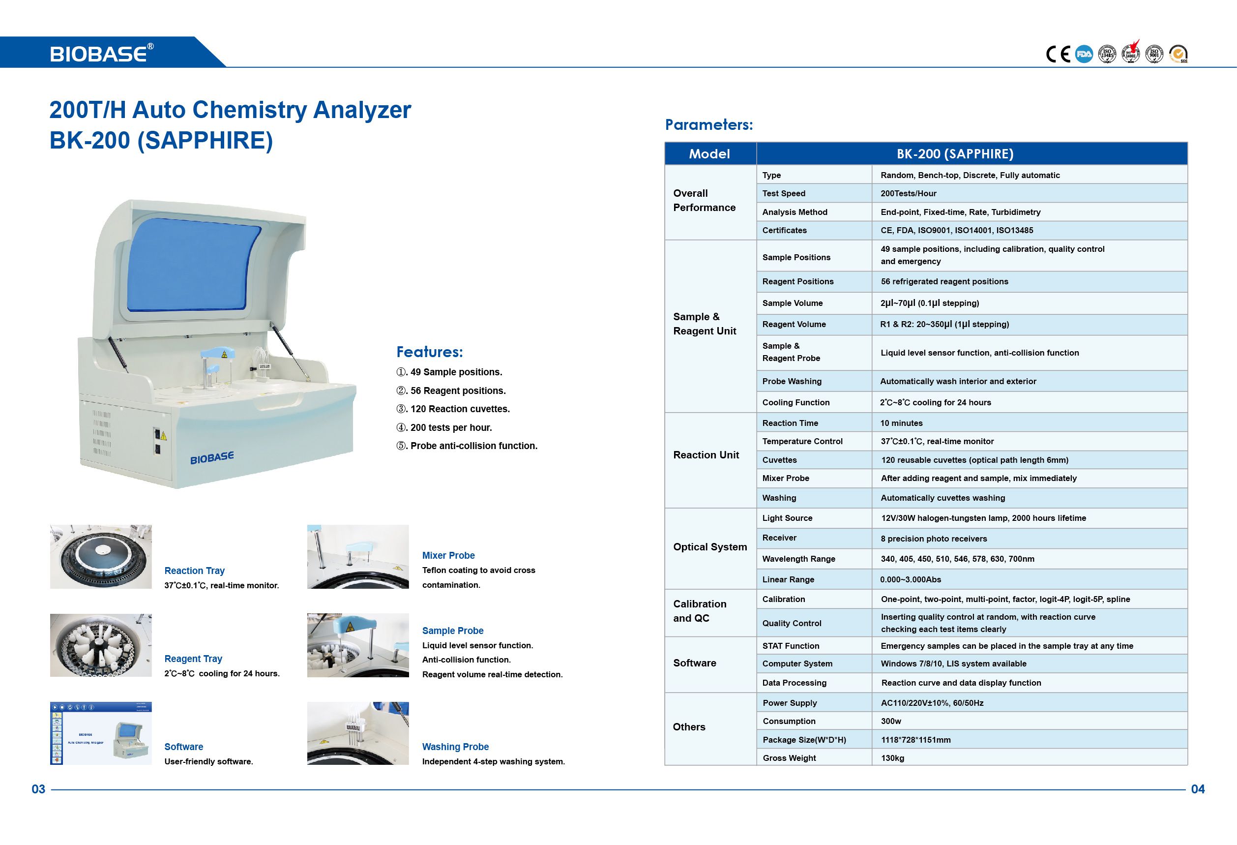 Features: 49 Sample positions; 56 Reagent positions; 120 Reaction cuvettes; 200 tests per hour; Probe anti-collision function.
