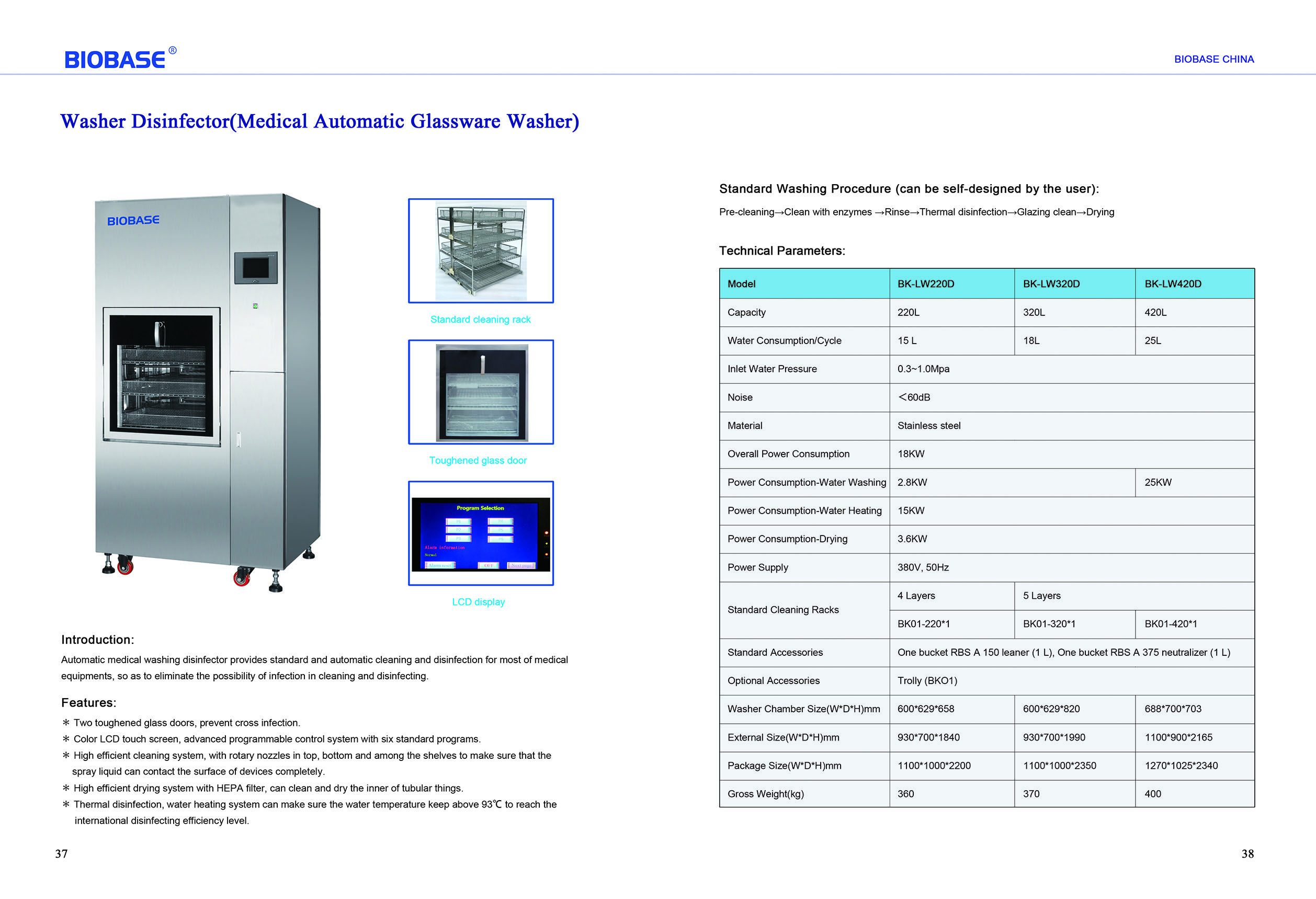 - High efficient cleaning system , with rotary nozzles in top ,bottom and among the shelves to make sure that the spray liquid can contact the surface of devices completely .