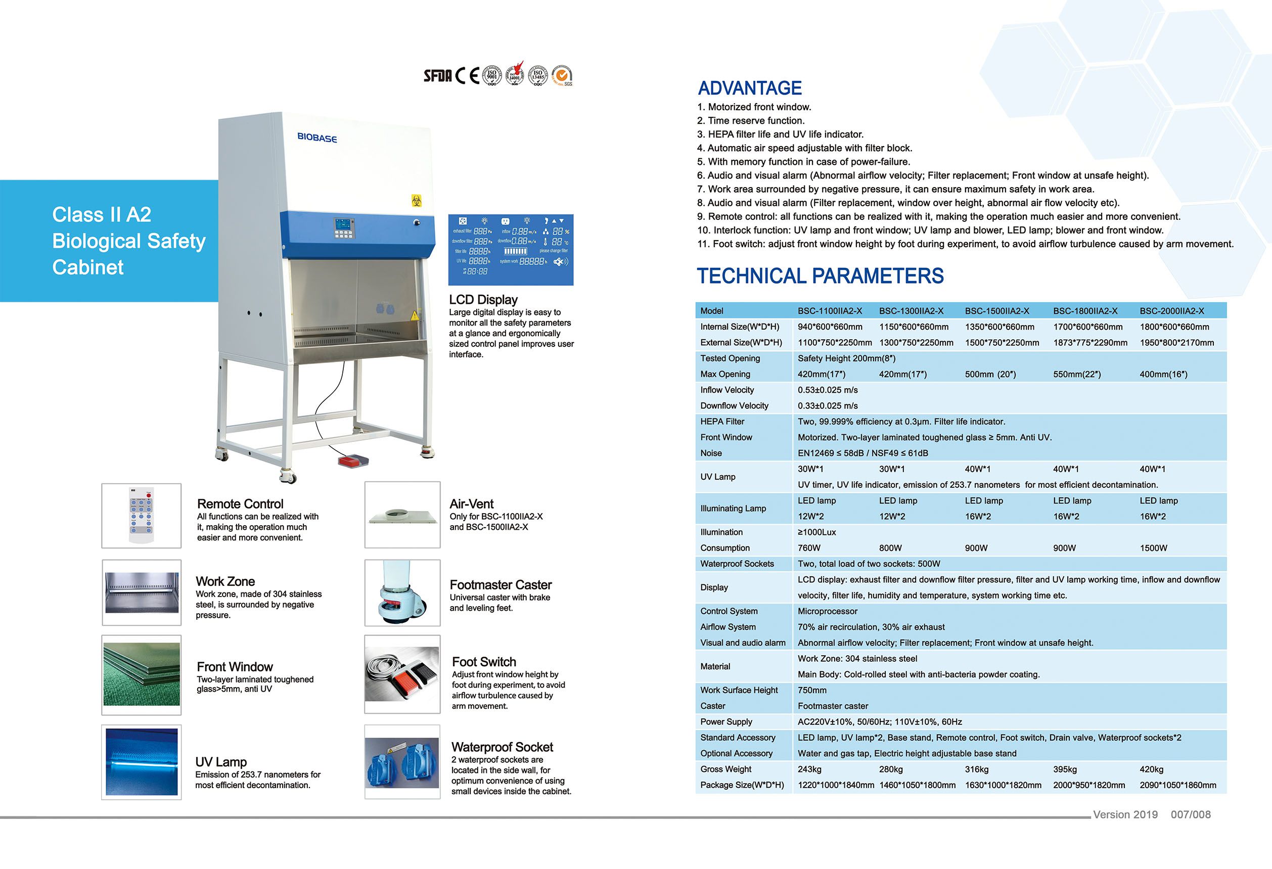 LCD display: exhaust filter and downflow filter pressure, filter and UV lamp working time, inflow and downflow velocity, filter life, humidity and temperature, system working time etc.