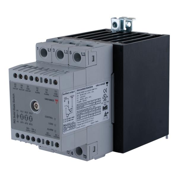 Carlo Gavazzi RGC3A60D25GKEDM ສະຫນາມສະເລີຍ Solid State Relays 3-pole DIN-rail mount SSR, ການສະຫນອງ Zero-cross ພ້ອມການກວດສອບ, ຄວາມແຮງແຮງງານ (Ue): 90 - 660 Vac (1200 Vp), ກຳນົດກຳລັງກະທົບ (Ie): 25 Aac, ຄວາມແຮງຄວບຄຸມ (Uc): 5 - 32 Vdc, ສະໜອງພາຍນອກ: 24 Vdc/ac, ການປ້ອງກັນເກີນແຮງງານທີ່ມີຢູ່ໃນໃນ