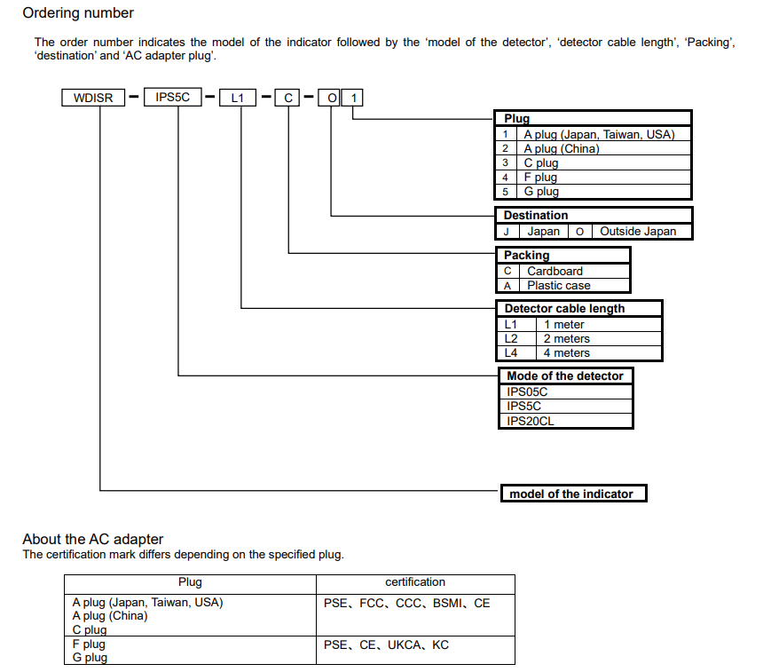 Accessories, Attachments: Detector, Detector cable (Ordering number), Joint OW-20, SC-3 with the screw hole of M4, M5, M6, M8 and M10, AC adaptor, Rubber foots