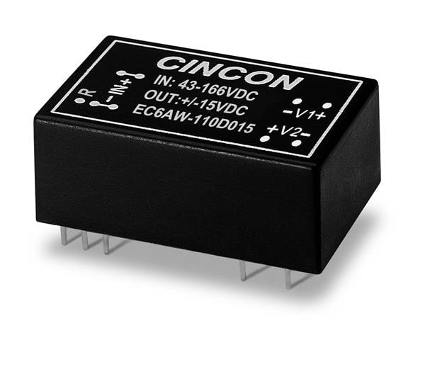Cincon EC6AW-110D05N ຕົວແປກະສົດ DC-DC ທີ່ແຍກອອກ, 10 ວັດ, ຊ່ວງຂາວເຂົ້າ 4:1, ຂາວເຂົ້າ 43-160VDC, ຂາວອອກ +/-5VDC, ກຳລັງສົດ +/-1000mA, ປະສິດທິພາບ 85%, ລັກສະນະລົດຕົວຕົນ