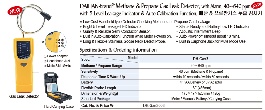 DaiHan DH.Gas3003 ເຄື່ອງກວດຈັບການຮົ່ວໄຫຼຂອງອາຍແກັສມີເທນ ແລະໂປຣເປນ (40 ~ 640 ppm) | EMIN.COM.LA