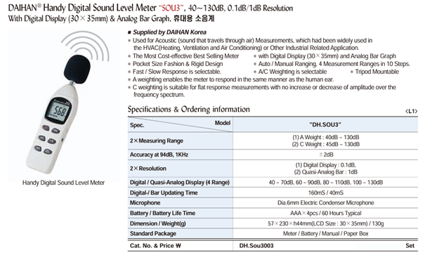 Digital / Quasi-Analog Display (4 Range): 40 ~ 70dB. 60 ~ 90dB. 80 ~ 110dB. 100 ~ 130dB