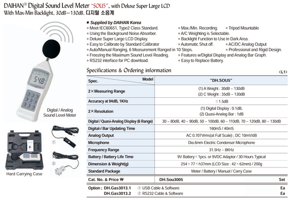 Digital / Quasi-Analog Display (6 Range): 30 ~ 80dB. 40 ~ 90dB. 50 ~ 100dB. 60 ~ 110dB. 70 ~ 120dB. 80 ~ 130dB