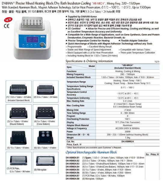 Included Standard Block: 1.5/2㎖ Tubes×24 holes, 1500rpm, hole Φ10.9×30.8mm