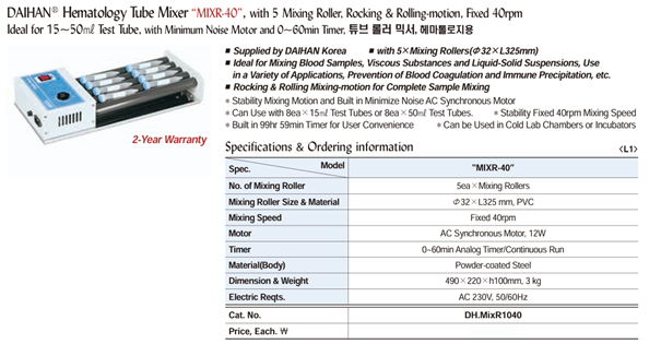 DaiHan MIXR-40 ເຄື່ອງປະສົມທໍ່ hematology (5ea×Mixing Rollers, 40rpm) | EMIN.COM.LA