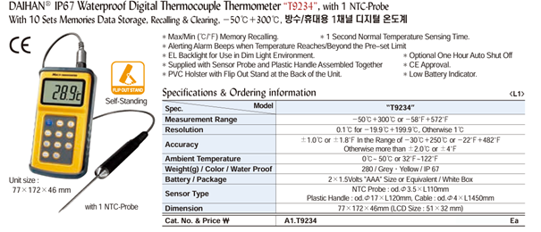 Sensor Type: NTC Probe : od.Φ3.5×L110mm; Plastic Handle : od.Φ17×L120mm; Cable : od.Φ4×L1450mm