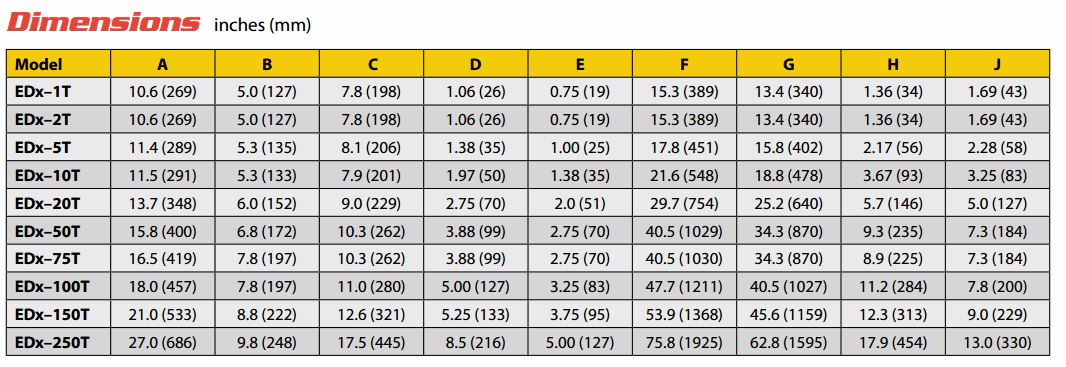 -Proof Load:150% of capacity up to EDx-75T. 110% of capcity Edx-100T and above.
