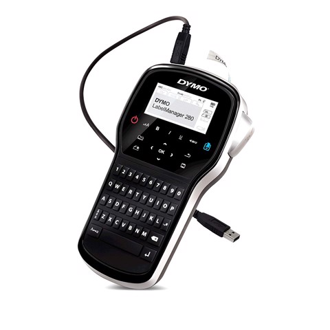 - Including a DYMO LabelManager 280 Label Maker, an AC Adapter (9V-2A), a li-ion rechargeable battery, a user manual, a D1 Black/White Tape 12mm x 3m