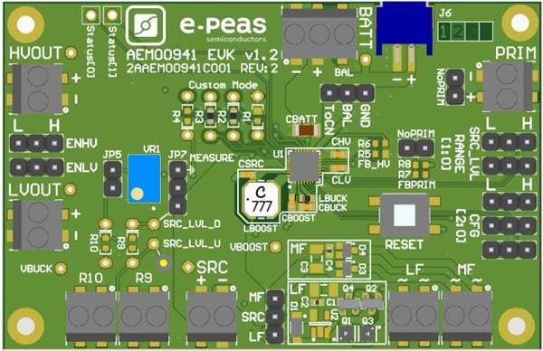 e-peas EVK00941 ບອດປະເມີນ 2AAEM00941C001 ບອດປະເມີນການສະຫວັນພະລັງງານ (AEM00941 - PMIC ຂະໜາດກະທົບສູງທີ່ມີການກຳນົດລະດັບແຮງແສງແຫຼ່ງພະລັງງານ)