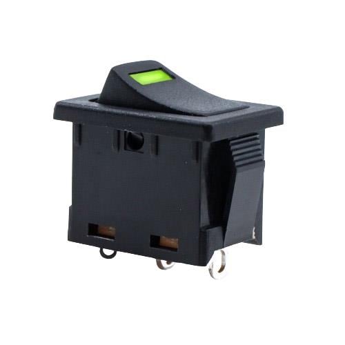 E-Switch R1966ABLKBLKESGRN ສະຫນັບສະຫນູນ Rocker ROCKER, 15A 125VAC, SPST ປິດ-ເປີດ, ຕິດຕັ້ງແຜ່ນ, ການຕິດຕັ້ງ Snap-In Solder | EMIN.COM.LA