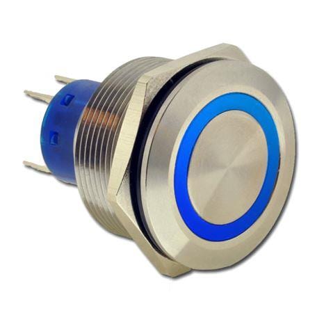 E-Switch ULV8F2BSS341 ຕ້ານການທຳລາຍ Anti-vandal, SPDT, On-(On), ຕິດຕູ້, ດ້ານໜ້າ, ເງິນ, LED, ສີຟ້າ, IP67 | EMIN.COM.LA