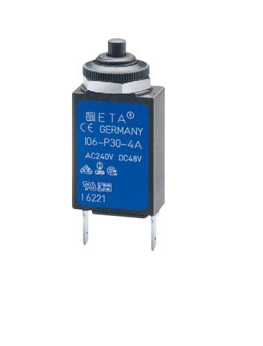 E-T-A Circuit Breakers 106-M2-P30-4.5A Thermal Overcurrent Min Ord Qty 50. ຕັບກົດວົງຈອນຄວາມຮ້ອນຂະໜາດນ້ອຍສຸດ 50 ຊິ້ນ. ຕັບກົດວົງຈອນຄວາມຮ້ອນຂະໜາດນ້ອຍສຸດຊິ້ນດຽວມີການກົດປຸ່ມເພື່ອກູ້ຄືນ, ບໍ່ມີການລະບາດ, ມີການກະທົບທີ່ຮ້າຍແຮງ (R-type TO CBE ຕາມ EN 60934), ການຕິດຕັ້ງໂດຍການກວດເກັບ. ຮັບຮອງຕາມມາດຕະຖານ CBE EN 60934 (IEC 60934). ສໍາລັບອັດຕາກະທົບສູງກວ່າ