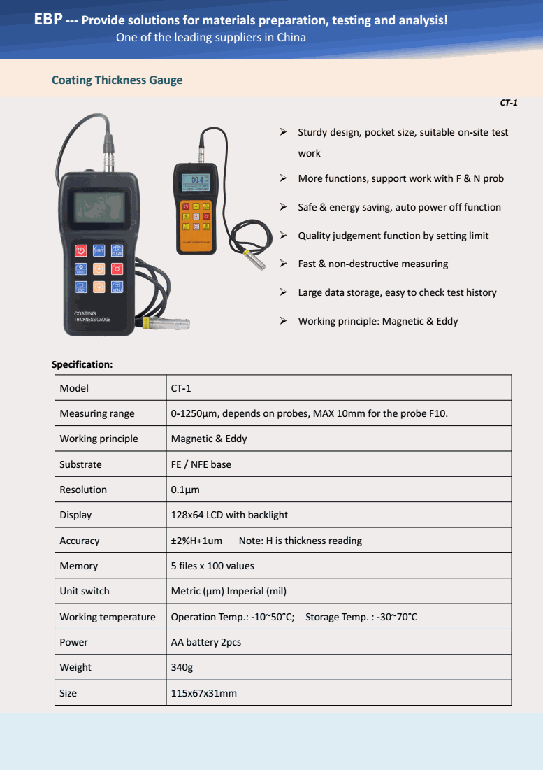 EBP CT-1 ເຄື່ອງວັດແທກຄວາມຫນາຂອງການເຄືອບ (0-1250μm; ±2%H+1um) | EMIN.COM.LA