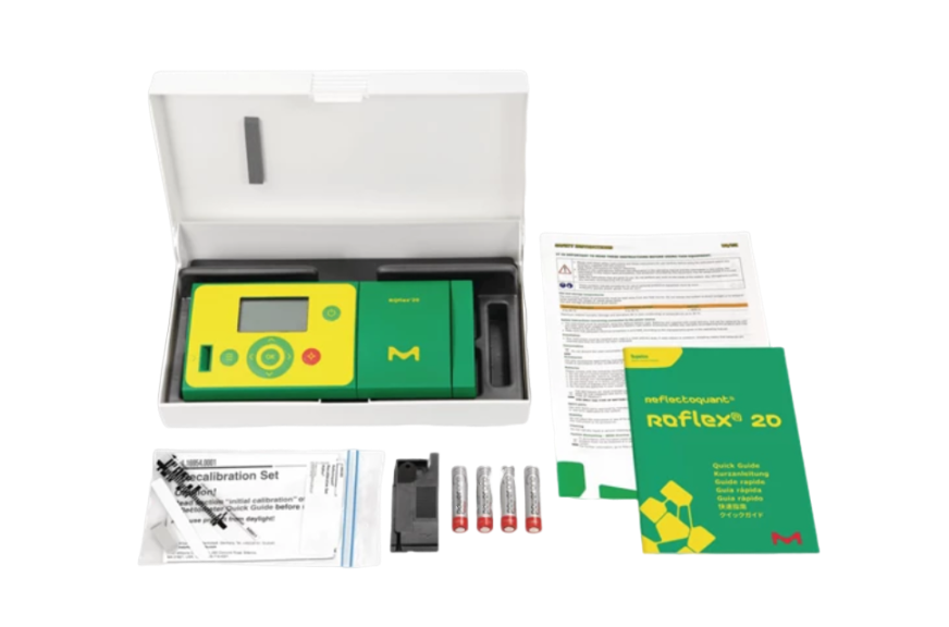 The device is very user-friendly and has a clear LCD display. The user interface is clear and simple. With its dual optics, wavelength correction and load-specific adjustment, the reflectometer is capable of accurate measurements. In addition, it is easy to take along in the field. The Reflectometer is supplied with batteries and accessories in a handy case (excl. test strips).