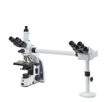 Trinocular version with 1 extra binocular head. Siedentopf 30° inclined tubes. Interpupillary distance 48-75 mm with diopter adjustment on left tube.