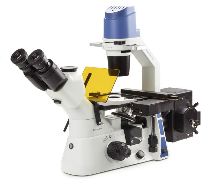 Trinocular head, 45° inclined tubes. Tubes can be positioned in upper or lower positions