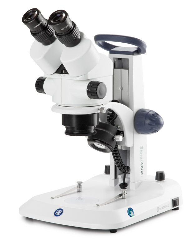 Rack and pinion stand. Maximum object height 35 mm. Supplied with black/white stage plate, transparent plate and 2 object clamps