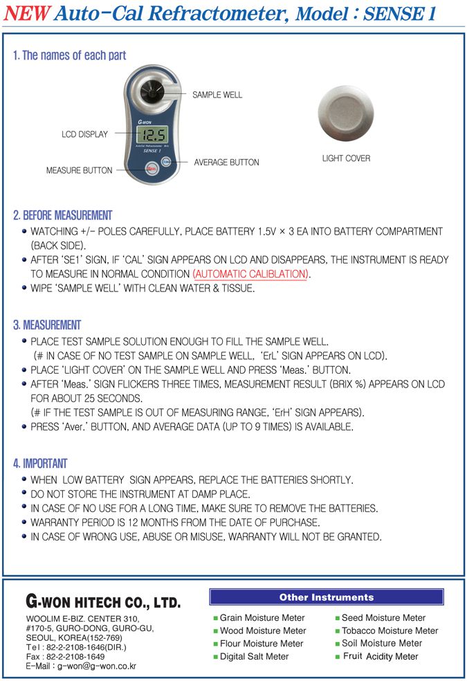 G-won SENSE I Auto-Cal Refractometer (0~53,0 Brix%, ± 0,2 Brix%) | EMIN.COM.LA