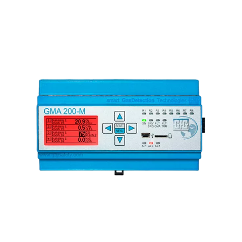 Inputs: 16 analog inputs (4–20 mA or 0.2–1 mA); max. 50 Ohm input resistance; 2 digital inputs: Acknowledgement of alarms can be freely configured; 2x RS485 BUS (for connection of external relay modules or digital transmitters in BUS wiring); 1x RS485 BUS (for digital transfer of measured and output data to a higher-level control centre or with master functionality of a GMA 200-MT for the connection of GMA 200-RT relay modules)