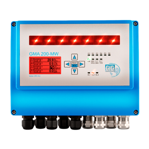 External relay module: 16 relays per module; up to 4 relay modules per GMA 200-MW4 system (for up to 64 additional relays); freely configurable for single alarms per measuring point and alarm threshold, configuration of collective or group alarms, fault messages and voting functions
