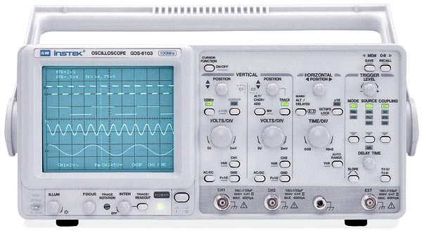 Vertical: V/div(CH1,CH2),UNCAL,ALT/CHOP/ADD,INV, probe factor,AC/DC/GND Horizontal: s/div(MTB, DTB), UNCAL, x 10MAG, delay time , HO Trigger: source, coupling, slope, level, TV-V, TV-H Others: X-Y lock, save/recall MEM 0-9 (GOS-6103/GOS-6103C) |