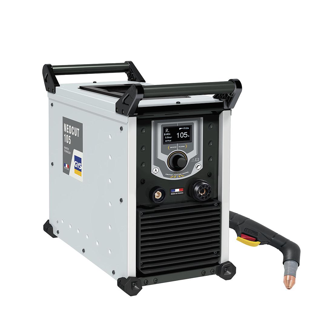 The NEOCUT 105 is a plasma cutter with a duty cycle of 100% at 105 A for cutting work up to 50 mm thick in industrial environments. It is equipped with automatic air pressure management, in all modes, offering optimum cutting quality throughout the lifespan of the consumables. Can also be connected to a cutting table, its «Marking» mode is perfect for tracing and identifying parts.