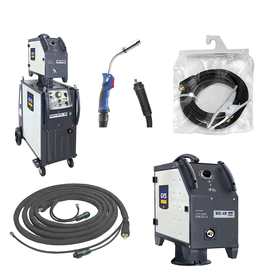 The MAGYS 400 GR with its wire feeder is a “synergic” 3-Phase MIG/MAG with an air cooled system. Its heavy duty design and high duty cycle make it ideal for industrial environments welding steel, stainless-steel and aluminium. The cables, available either of 5 to 10 meters, are perfectly suited for intensive work up to ø1.2.