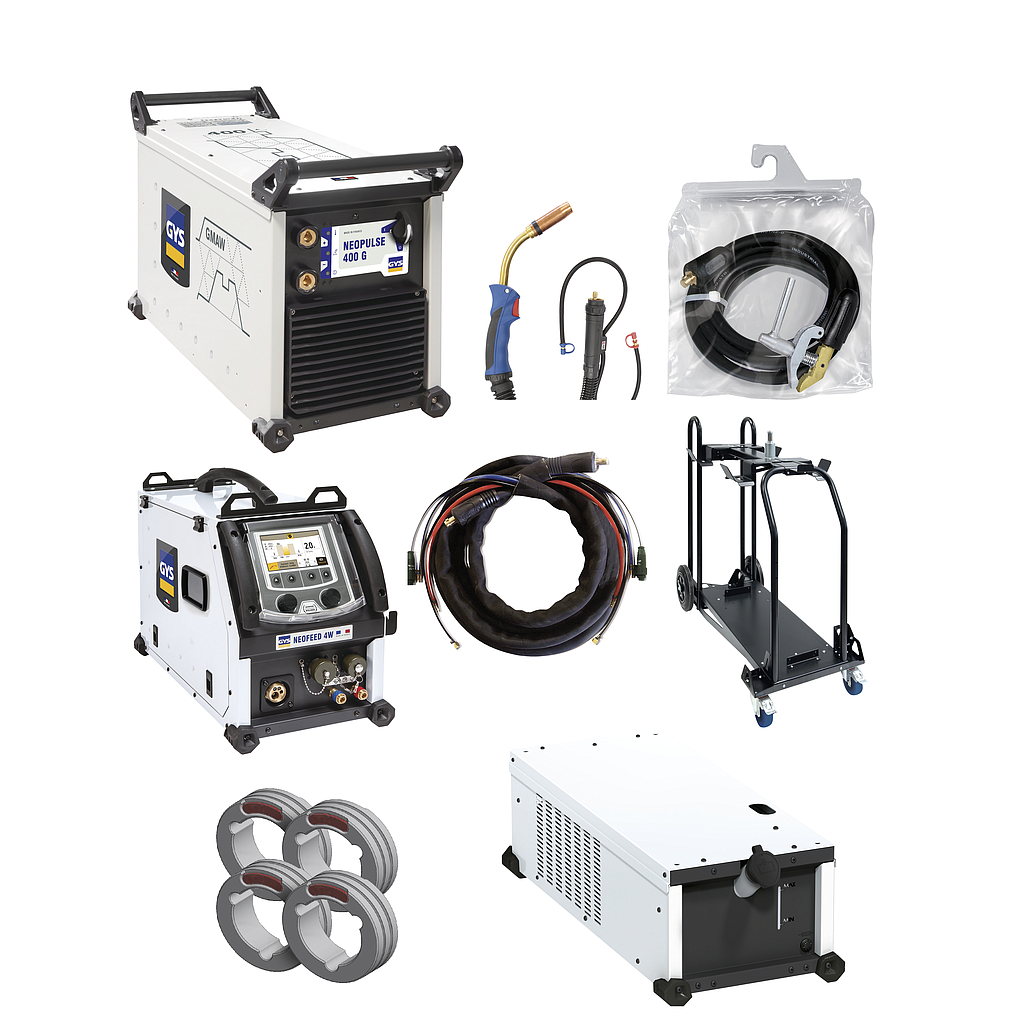 Digital technology, the NEOPULSE 400 G is a pulsed MIG/MAG welding power source with a separate wire feeder. Ultra high performance and designed for the highest performance level using the latest technology, it features +100 synergic curves and exceptional arc quality/performances. Intuitive and highly functional, its digital interface allows you to change welding parameters with ease. Equipped with its NEOFEED-4W reel (optional), this welding power source provides productivity and quality of unmatched welding on all types of alloys.