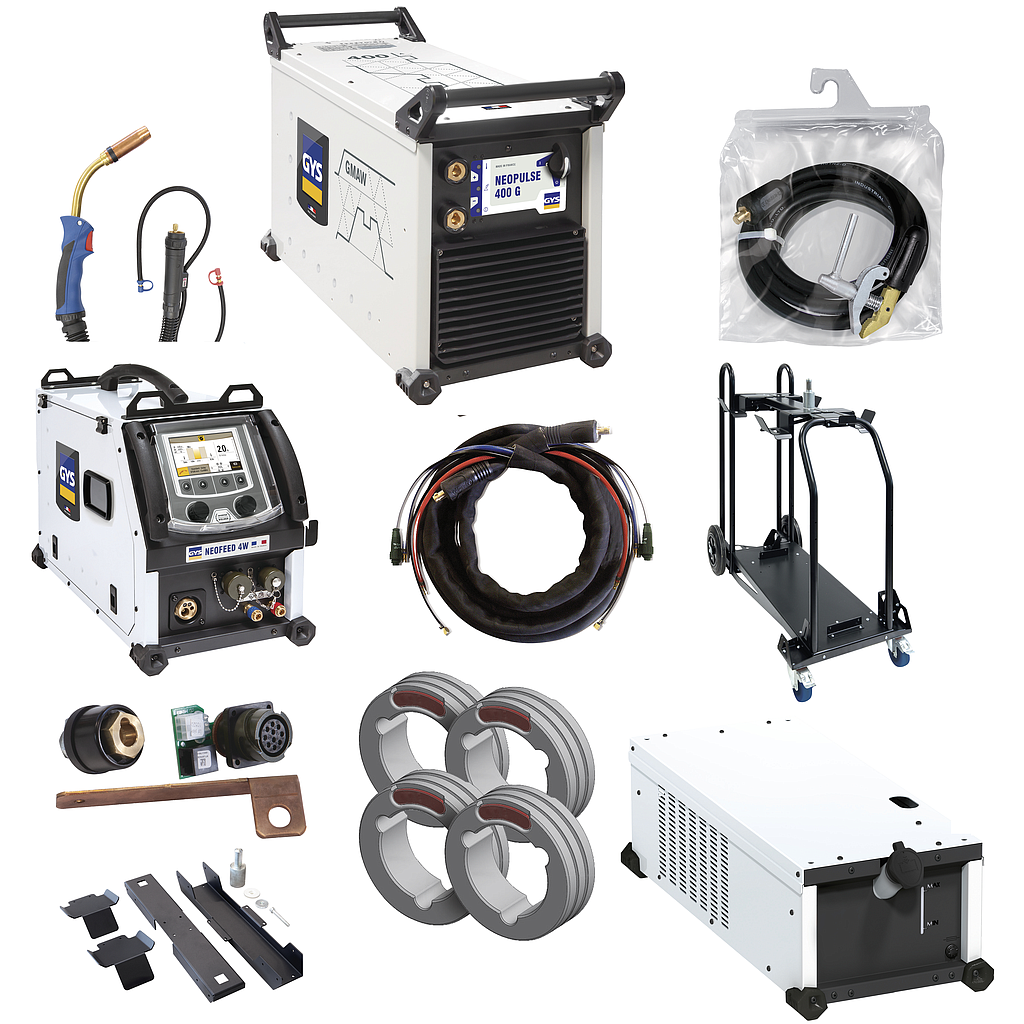Digital technology, the NEOPULSE 400 G is a pulsed MIG/MAG welding power source with a separate wire feeder. Ultra high performance and designed for the highest performance level using the latest technology, it features +100 synergic curves and exceptional arc quality/performances. Intuitive and highly functional, its digital interface allows you to change welding parameters with ease. Equipped with its NEOFEED-4W reel (optional), this welding power source provides productivity and quality of unmatched welding on all types of alloys.